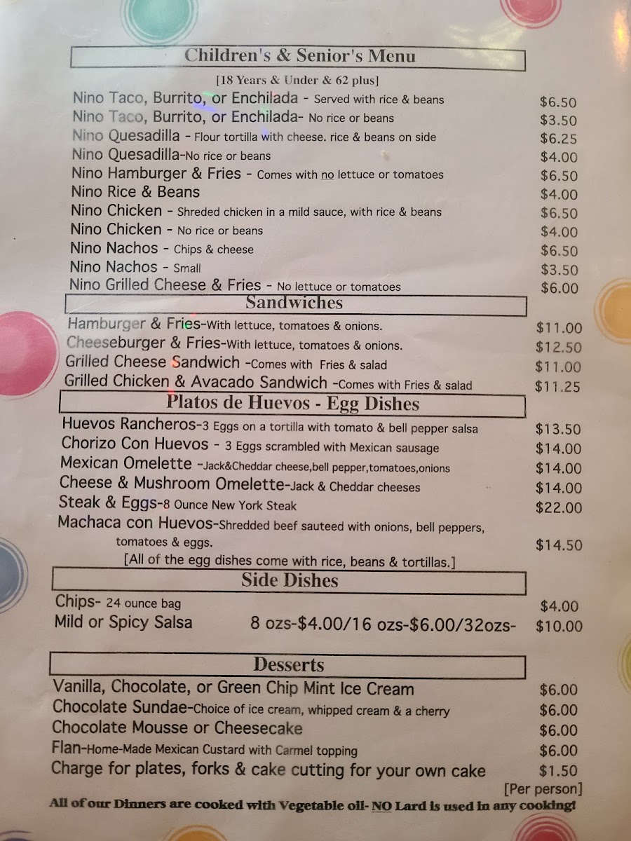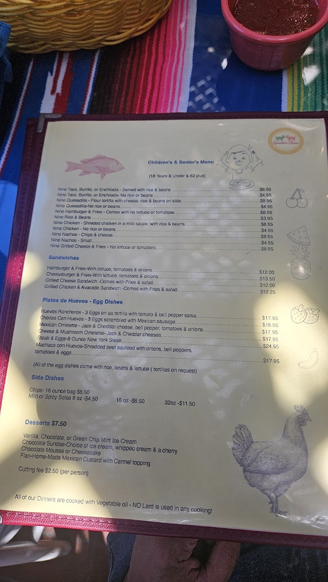 - Children’s and seniors’ menus with familiar favorites served with rice and beans